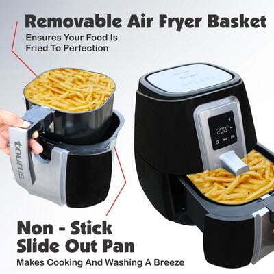 | Cook your favorite snacks or meals all in one appliance! Taurus Fun Fry ensures proper air circulation to maintain the right temperature. The smart appliance heats food from all sides so that you enjoy tasty, crunchy & healthy snacks or meals in 30 minutes or less. | This air fryer features a large touchscreen display with a variety of settings, required Temperature Range from 180°C-200°C, Timer settings & Start/Stop button to make it easier to change settings mid-cycle. The ideal settings for each dish allows more accurate and precise cooking, you can’t go wrong with this digital air-fryer. | |